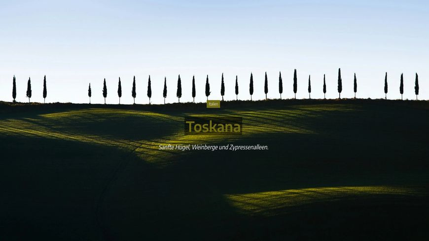 Sanfte Hügel, Weinberge und Zypressenalleen.