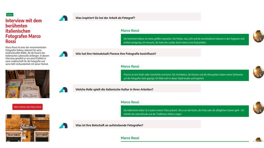 <p><span style="font-size: 16px; font-family: q4a8vLYMGXDgCFk4f;">Marco Rossi ist einer der renommiertesten Fotografen Italiens, bekannt für seine eindrucksvollen Bilder, die die Essenz des italienischen Lebensstils einfangen. In diesem Interview gewährt er uns einen Einblick in seine Leidenschaft für die Fotografie und seine tiefe Verbundenheit mit seiner Heimat.</span><span style="font-family: q4a8vLYMGXDgCFk4f; font-size: 16px;"><img src="https://space.novamag.de/teams/SzbbGRHujJkkqNwDb/2xk3W4XJNvARnFFrr-article.jpg" data-expand="false" data-source="2xk3W4XJNvARnFFrr" data-original="2xk3W4XJNvARnFFrr" data-alt="emily-levine-o1l5ByuccNI-unsplash" data-src="https://space.novamag.de/teams/SzbbGRHujJkkqNwDb/2xk3W4XJNvARnFFrr-thumbnail.jpg" style="width: 100%;" class="fr-fic fr-dib"></span></p><p style="text-align: center;"><br><span style="font-size: 16px; font-family: q4a8vLYMGXDgCFk4f;"><button class="fr-nova-button" contenteditable="false" data-background-color="rgb(205, 33, 42)" data-color="rgb(255, 255, 255)" data-hover-style="invert" data-href="novamag.de" data-quick-style="custom" data-reactroot="" data-target="_blank" style="background-color:rgb(205, 33, 42);border-color:rgb(205, 33, 42);border-radius:5px;border-style:solid;border-width:1px;box-shadow:rgba(0, 0, 0, 0.1) 0px 1px 3px 0px, rgba(0, 0, 0, 0.06) 0px 1px 2px 0px;color:rgb(255, 255, 255);font-family:q4a8vLYMGXDgCFk4f;font-size:14px;font-weight:500;line-height:normal;overflow:visible;padding:10px;transition:0.2s ease-in-out" type="button">Mehr erfahren über Marco Rossi</button></span></p><p style="text-align: left;"><span style="font-size: 16px; font-family: q4a8vLYMGXDgCFk4f;"><img src="https://space.novamag.de/teams/SzbbGRHujJkkqNwDb/vnFHc74JKTxAYrRPP-article.jpg" data-expand="false" data-source="vnFHc74JKTxAYrRPP" data-original="vnFHc74JKTxAYrRPP" data-alt="marco-calignano-4ZtaOE_No54-unsplash" data-src="https://space.novamag.de/teams/SzbbGRHujJkkqNwDb/vnFHc74JKTxAYrRPP-thumbnail.jpg" style="width: 100%;" class="fr-fic fr-dib">Dieses Gespräch mit Marco Rossi zeigt, wie eng die Fotografie mit der italienischen Kultur verbunden ist und wie sehr er seine Heimat durch seine Arbeit feiert.</span></p>